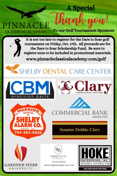 Please be sure to register for our upcoming Golf Tournament. All proceeds are for the Dare to Soar Scholarship Fund. Please visit www.pinnacleclassicalacademy.com/golf for more information.